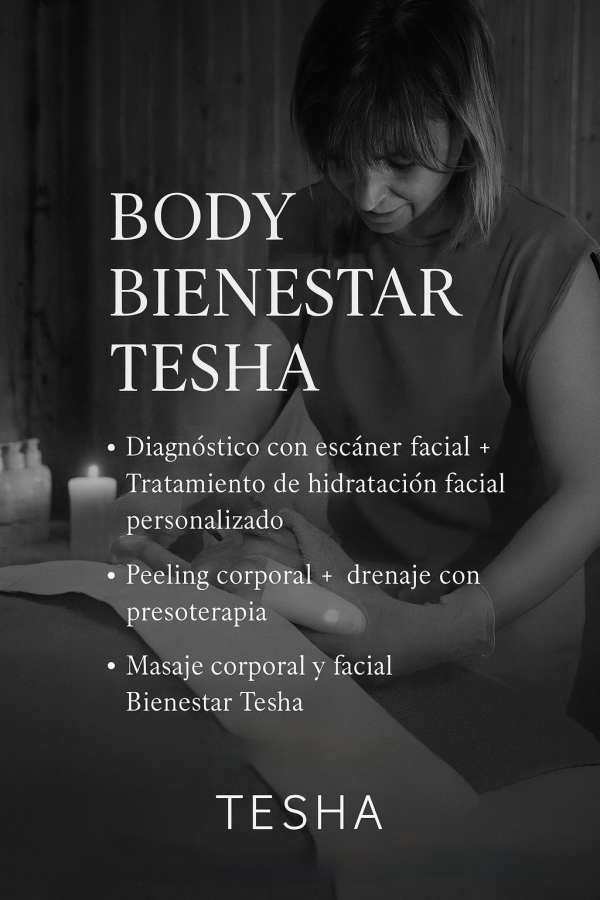 BODY BIENESTAR TESHA : Un ritual exclusivo de 3 sesiones diseñado para renovar cuerpo y rostro: diagnóstico facial avanzado, tratamiento de hidratación profunda, peeling corporal, drenaje con presoterapia y masaje integral Bienestar Tesha. Ideal para desconectar, mejorar la piel y recuperar equilibrio físico y emocional.